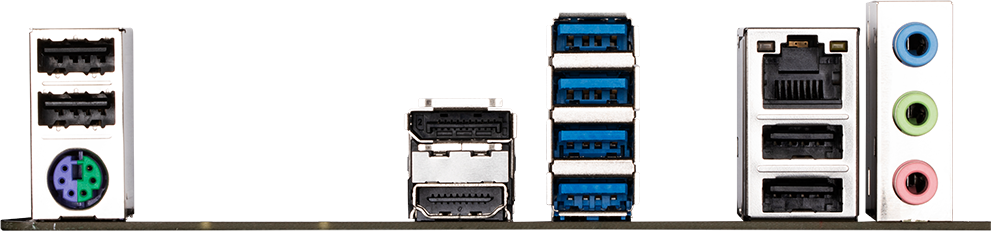 Разъемы на задней панели PS/2, 4 x USB 2.0, 4 x USB 3.2 Gen1, HDMI, DisplayPort, RJ-45